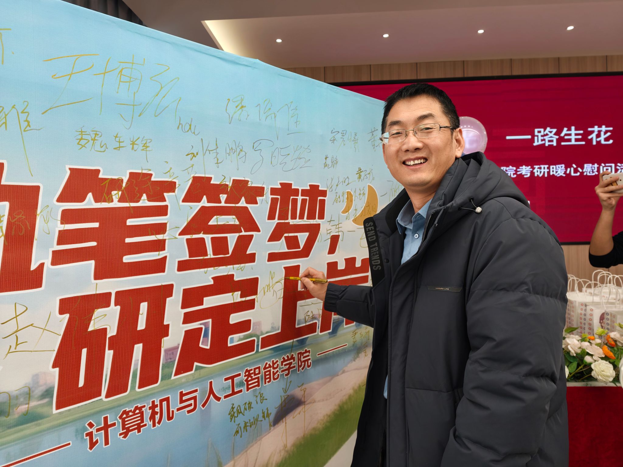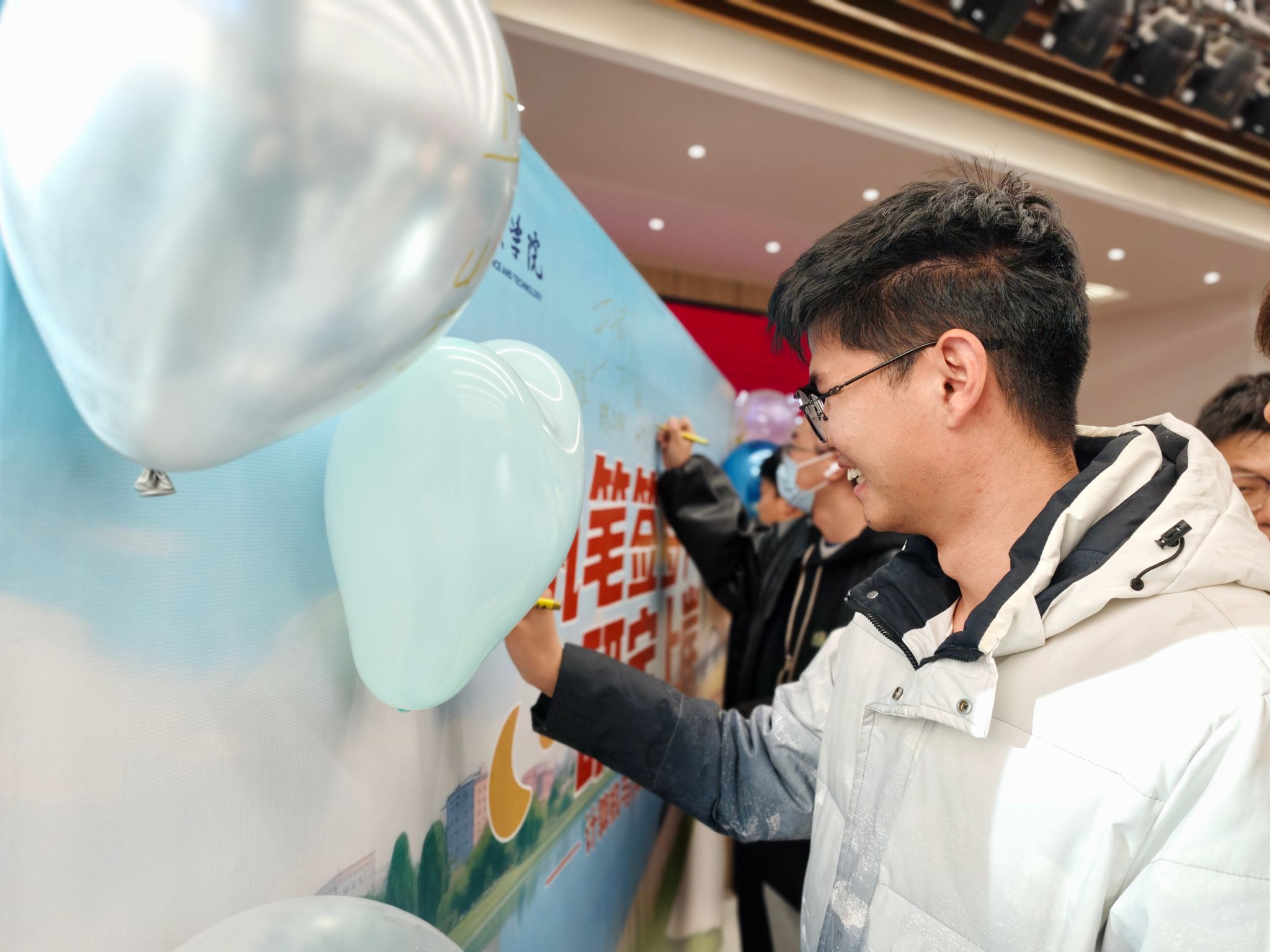活动伊始,“执笔签梦,研定上岸”寓意展板前暖意融融。学院教师与考研学子们纷纷在展板上郑重签下自己的名字,写下饱含决心与期许的寄语:“乘风破浪,前程似锦”“研途辛苦,必定上岸”……一笔一划间,不仅是对梦想的执着承诺,更传递着同窗之间的相互鼓励,及学院对考研学子的深切关怀,为活动拉开充满温度的序幕。