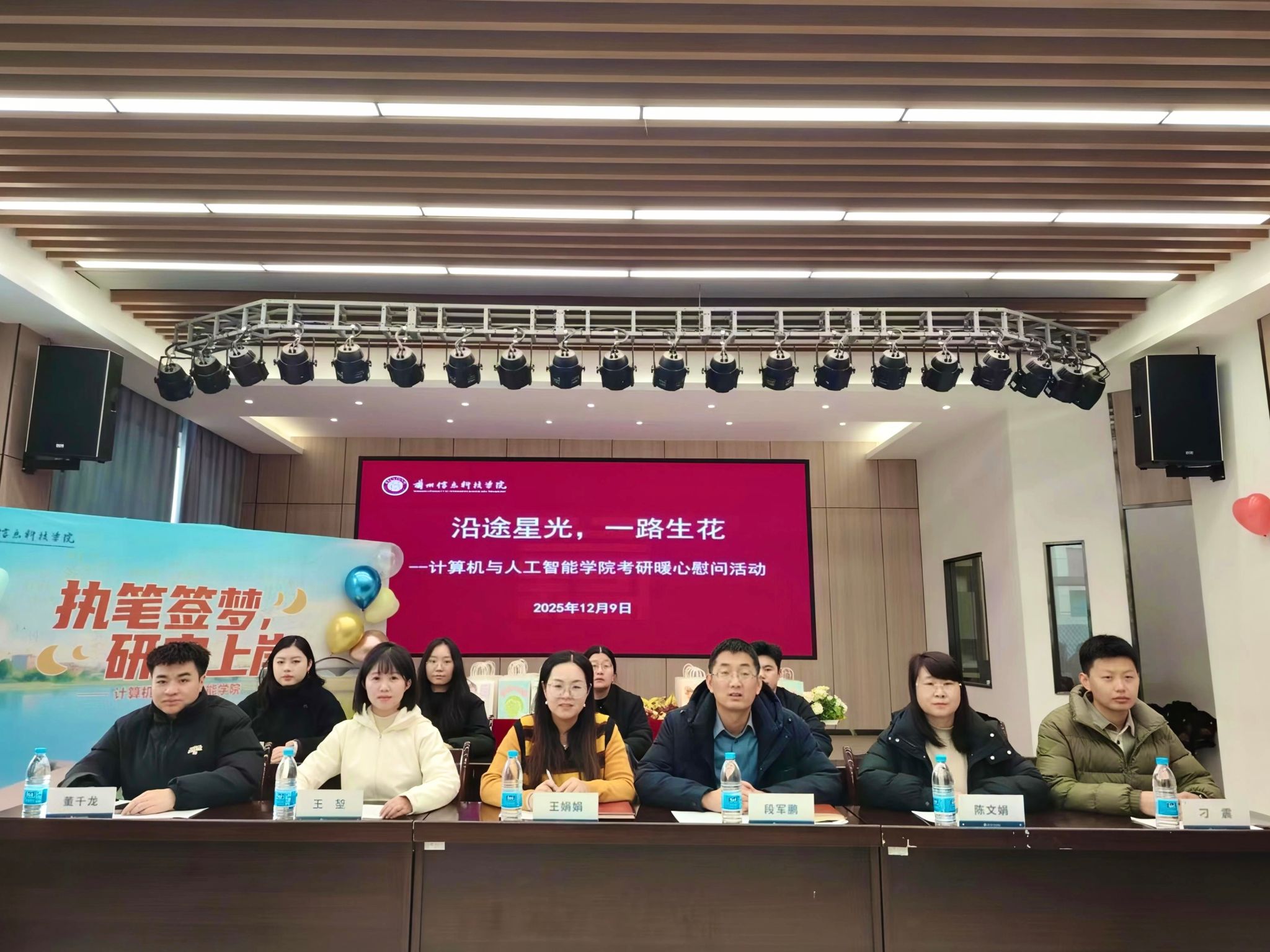 为深入落实立德树人根本任务,深化“三全育人”工作成效,助力2026届考研学子从容冲刺、逐梦前行,12月9日,计算机与人工智能学院在学校路演厅举办“沿途星光 一路生花”考研暖心慰问活动。学院党委书记、学生发展中心主任段军鹏,副院长王娟娟、陈文娟,考研辅导教师及全体毕业班辅导员与考研学子齐聚一堂,以专业指导、温情关怀与坚定支持,为学子们注入冲刺备考的强大动力。