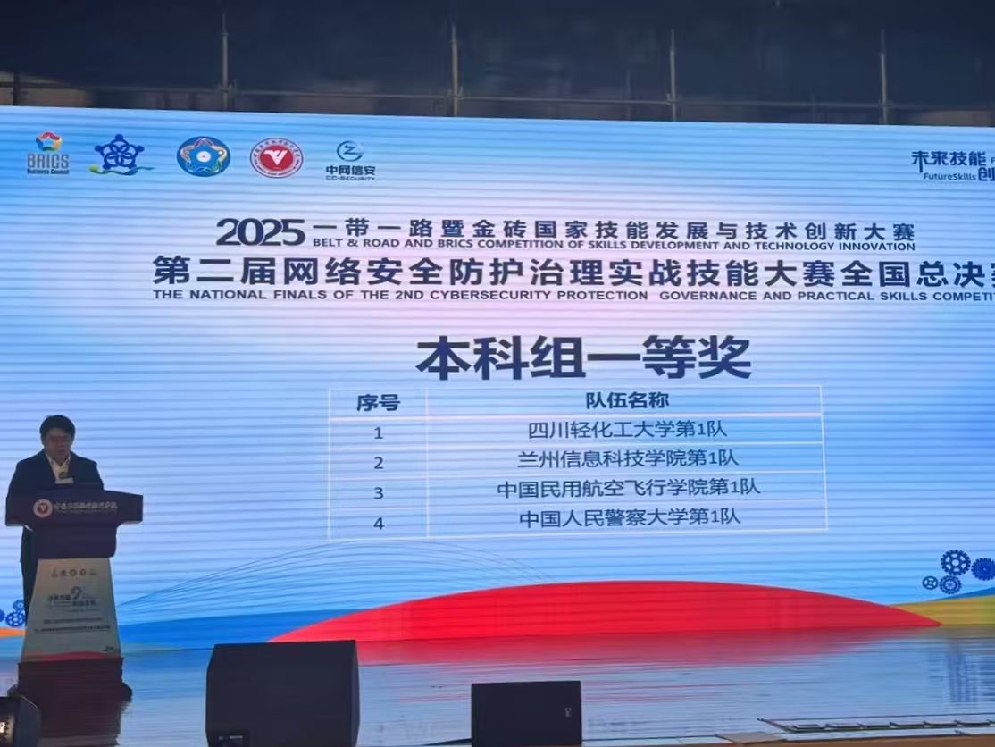 为加快构建高质量网络安全人才培养体系,12月15日,2025一带一路暨金砖国家技能发展与技术创新大赛之第二届网络安全防护治理实战技能大赛全国总决赛在中国民用航空飞行学院圆满落幕。兰州信息科技学院计算机与人工智能学院参赛团队凭借扎实的专业功底与高效的实战能力斩获本科组一等奖,是省内同类院校唯一获奖高校。