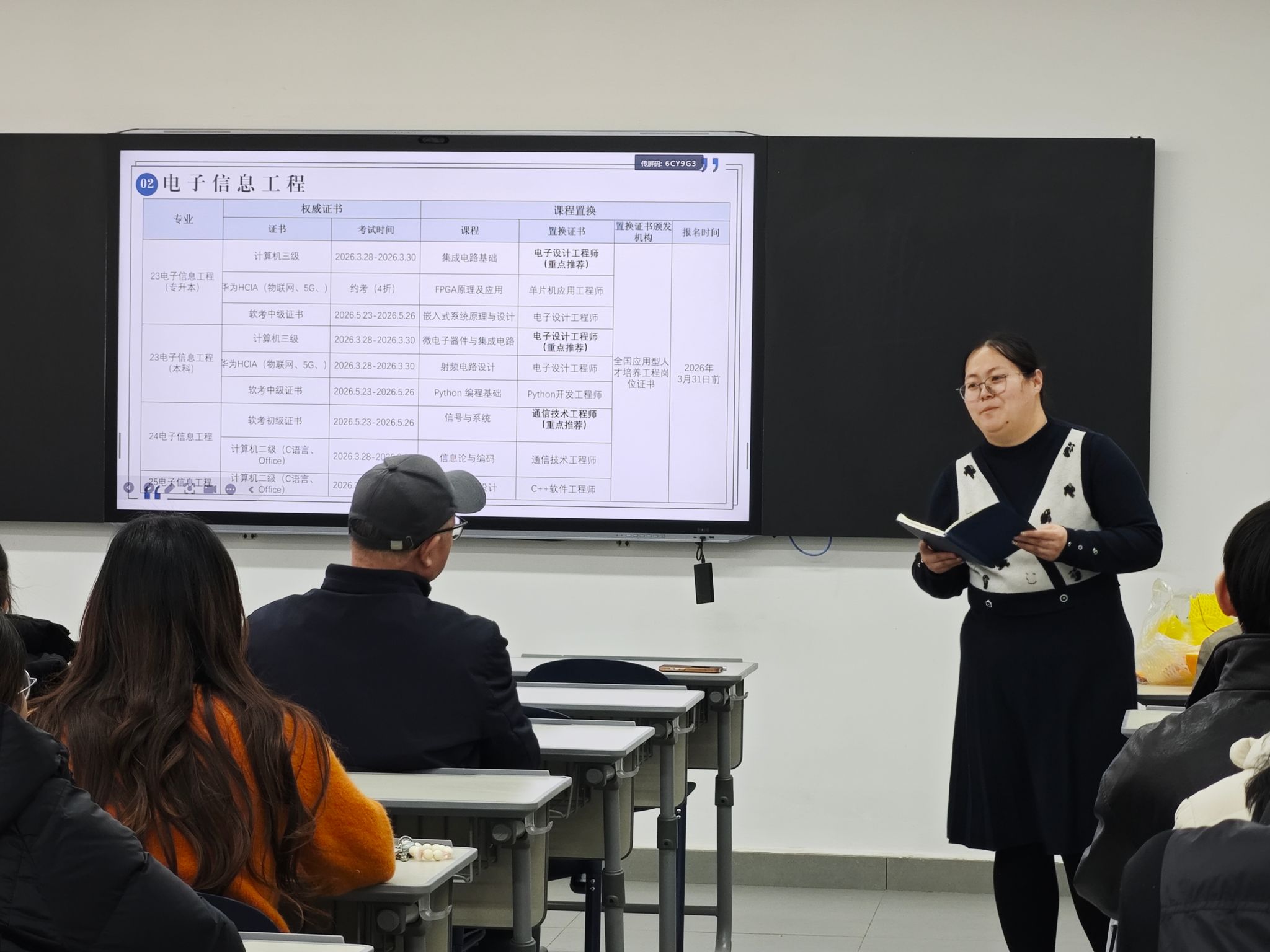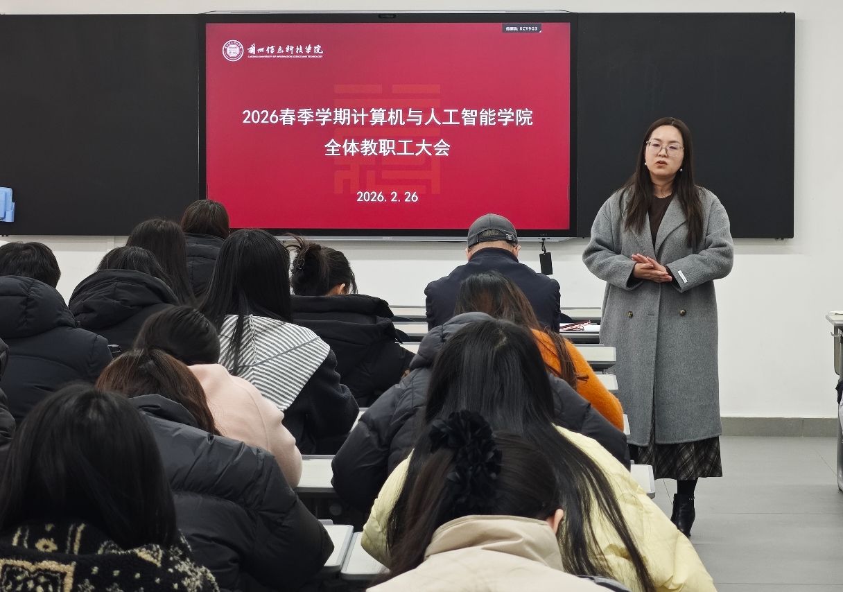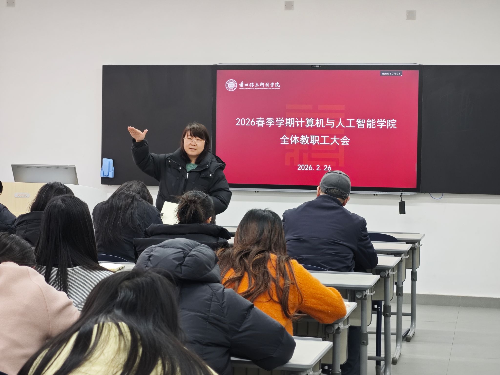 春潮涌动启新程,凝心聚力向未来。2026年2月26日,兰州信息科技学院计算机与人工智能学院在1教202教室召开2026年春季学期全院教职工大会,全面总结上学期工作成效,全面部署新学期本科教学合格评估迎评促建、教育教学改革、人才培养等核心工作,凝聚全院共识、压实工作责任。学院领导班子成员及全体教职工参加会议。
