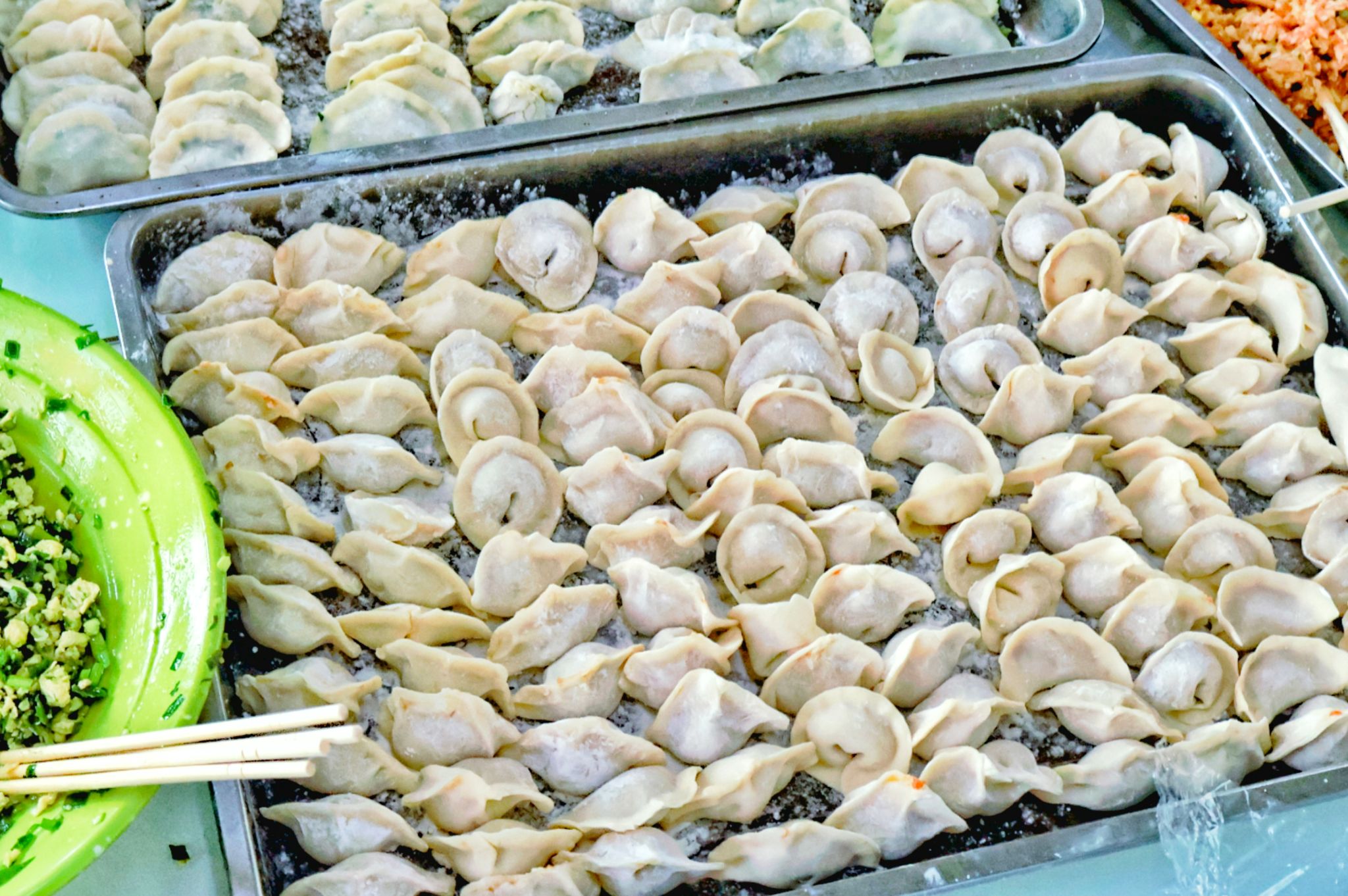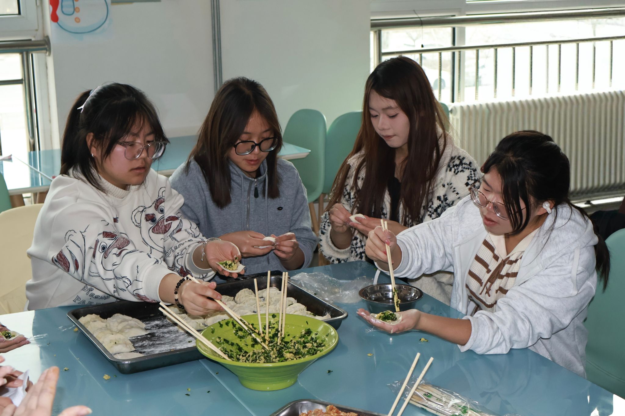 活动当天,参与者有序签到入座后,自发围成数个小组,分工协作、有条不紊。经验丰富的同学现场展示花式饺子的包法,引得周围同学纷纷赞叹、踊跃效仿。忙碌的间隙,大家时而欢声笑语,时而歌声悠扬,欢快的氛围弥漫在餐厅每个角落,暖意融融。